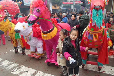 元宵佳节迎龙灯是占才的传统文化习俗,原来是正月十三起灯的,到十五满灯,由于过了初八后村里的许多年轻人都要外出打工,所以,按现在的实际情况与时倶进了,提前到正月初六、初七、初八这三天进行。迎龙灯不仅忙坏了大人,更乐坏了孩子们。你看,家家户户的女主人都在忙着烧各种美食来招待客人,而快乐的孩子们则提着各种大红灯笼笑得合不拢嘴。在彩灯的队伍中,队伍两头以锣鼓、火铳助兴,各种花灯,色彩纷呈,锣鼓鞭炮,响彻云霄。迎灯的队伍首先沿村庄而行,再到村口的“莲花塘”绕行两圈,以企盼来年的风调雨顺、国泰民安。每到宽阔处,则要“串灯”。十里八乡的观众摩肩接踵,争相追逐,翘首观望,热闹非凡。