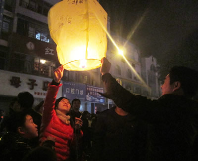 元宵节夜晚的德兴广场成了欢乐的海洋,人们点燃孔明灯,放飞梦想。满天璀璨的“星光”承载着大家对新年美好的祈愿越飞越高。  (记者  占淑英摄)